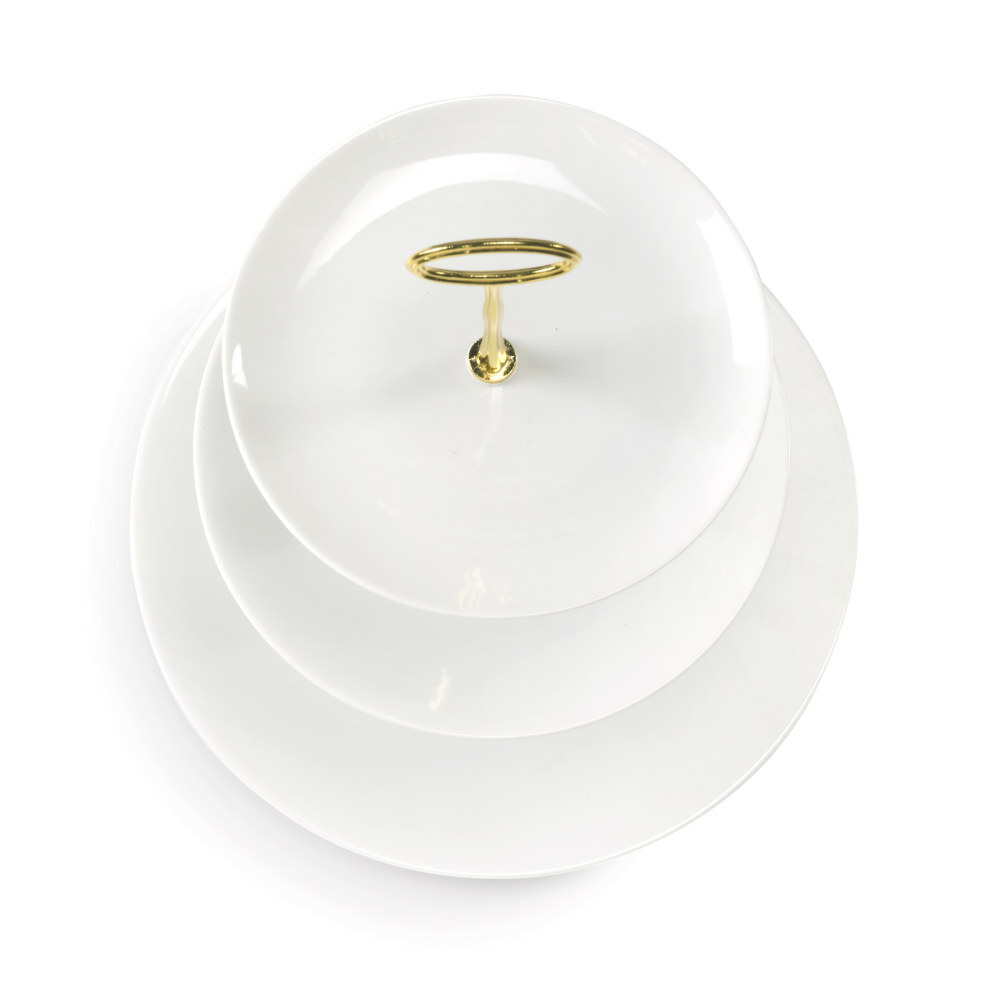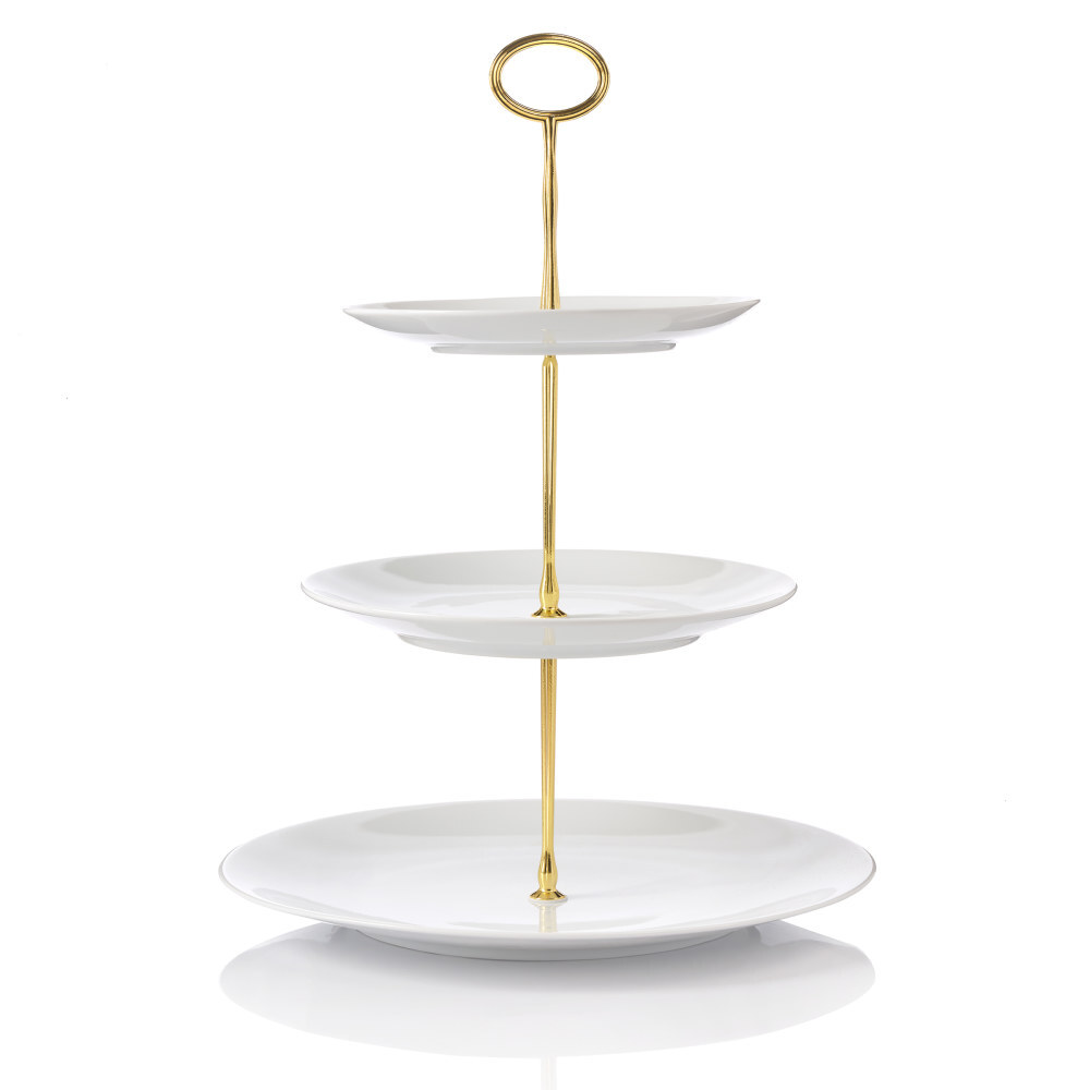Alzata tre livelli per dolci o frutta in porcellana bianca con asta dorata.